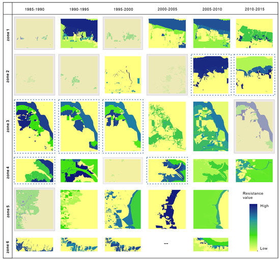 The tidal creeks were influenced by the resistance surfaces in zones 3, 4, and 6 in 1985–1990. Of these three zones, the resistance surfaces in only zone 6 were due to human activities. High resistance values appeared in all three zones in cases of both natural elements and human activities. The influence of human activities on the tidal creeks appeared in four zones in 1990–1995 (zone 1, 4, 5, and 6). The highest resistance values were distributed in zones 1 and 4, and local areas of zone 6. They featured composite resistance surfaces involving both natural influence and that of human activities. The resistance surfaces involving human activities began to appear in zone 2 in 1995–2000, and the resistance values in zones 5 and 6 increased. The most influential resistance surface in zone 3 was due to natural influence (coastal wetlands of saltwater) in all three periods. The resistance surfaces involving human activities began to appear in zone 3 in 2000–2005, although with a low resistance value. The highest resistance value occurred in zone 5. Natural elements played a major role in the resistance surfaces in zones 1 and 3. The resistance values decreased in zones 4, 5, and 6 from 2005–2010. Natural elements played a more significant role in the resistance surfaces than human activities in zone 1 and 2. The resistance surfaces acted only in zones 1, 2, and 4 from 2010–2015. The resistance values were generally low, and the highest resistance values were distributed in local areas.