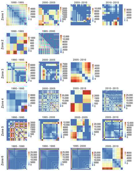 We chose resistance surfaces with the highest marginal R2 in each zone in the five-year period to distinguish between the distributions of the resistance values at the spatial–temporal scale (Figure 3). The results showed that high and low resistance values were distributed in different areas in different periods. Overall, the tidal creeks in the YRD were affected by both human activities and natural elements. The situation was reflected in the composite resistance surface that involved both human activities and natural phenomena. Moreover, the resistance surfaces in some zones involved only human activities, and those in others were composed solely of natural elements. There were three periods featuring resistance surfaces in zone 3 owing to the coastal wetlands of saltwater. By comparison, all resistance surfaces in zone 6 were composed of human activities.