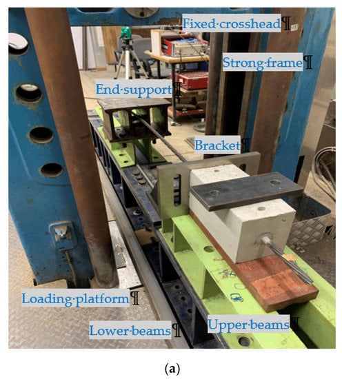 In Figure 4, the specimen, consisting of a concrete prism with a long grouted strand, is mounted horizontally onto the loading platform to simulate a typical partially bonded strand. The unbonded length of the tendon with soft wrapping is simulated by a free length of the strand in the experiment. As shown in Figure 4b, two sets of wedge and barrel anchors were mounted at the two ends of the strand to provide horizontal constraint, while linear variable differential transformers (LVDTs) with 50 mm stoke and load cells with maximum compressive force capacity of 300 kN were installed near these anchors to keep a record of the horizontal movements and forces induced from the imposed vertical midspan displacement. To impose vertical midspan loading displacement onto the specimen, a steel loading head was fixed to the underside of the crosshead and kept stationary throughout the test. The contact surface of the loading head with the strand had a curved shape and its position was adjusted with the help of laser positioning. During testing, the imposed vertical displacement would cause deformation of the strand as depicted by a dotted line in Figure 4b.