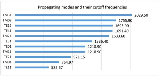 where is the radius of the waveguide, and is the zeros of the derivative of the Bessel function [18]. The propagation of waves can be either in the transverse electric (TE) mode or the transverse magnetic (TM) mode [30]. Since the permittivity (ε) and permeability (μ) of the natural gas are approximately the same as the ones of free space [31], the first propagating TE and TM modes and their cut-off frequencies for the 12-inch diameter circular waveguide are shown in Figure 4.