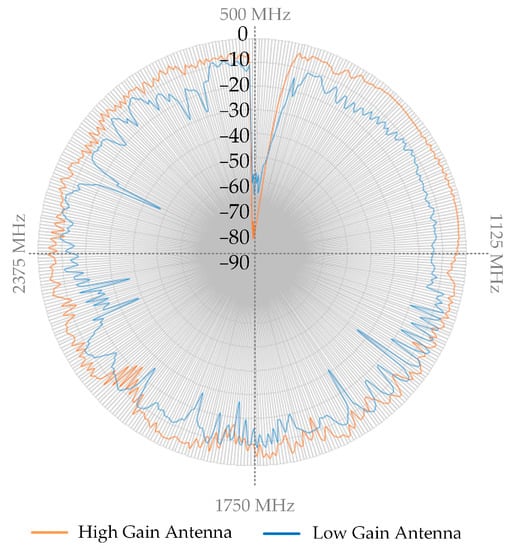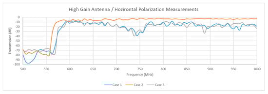The transmission response (loss) in Figure 13 shows major attenuation (at least under −30 dB) at the central frequency of 737.5 MHz. Similarly, the transmission response for the vertical polarization of high-gain antennas shows major attenuation at the central frequency of 914.5 MHz. On the other hand, the transmission response for both the vertical and horizontal polarizations of the middle-gain antennas shows major attenuation at the central frequency of 738 MHz. Finally, the transmission response for the vertical and horizontal polarizations of the low-gain antennas shows major attenuation at the central frequencies of 918.7 MHz and 737.5 MHz, respectively.