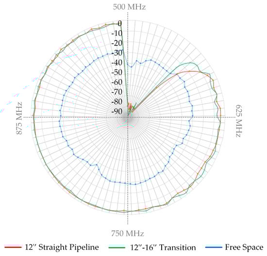As shown in Figure 7, comparing the communication loss over air to that within a circular waveguide with a 12-inch diameter at a distance of 10 m revealed a minimum increase of 25 dB inside the pipeline, which corresponded to a 500-fold improvement in communication performance.