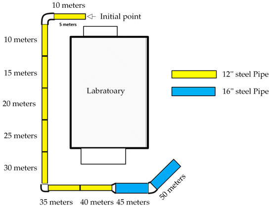 Attenuation tests were also conducted in a 50 m long pipeline, including both 12″ and 16″ straight pipelines with bend and transition parts that were constructed around the research center, as shown in Figure 8. The pipeline under test comprised eight 12-inch pipe sections, two 16-inch pipe sections, and two elbow joints. As depicted in Figure 8, the 12-inch pipes are denoted by yellow, while the 16-inch pipes are represented by blue.