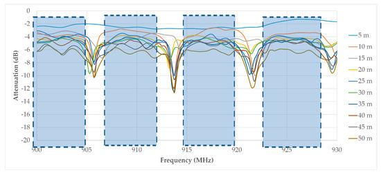 In this case, new VNA measurements were performed for the frequency interval of 900 MHz to 930 MHz, with a higher spectral resolution of 0.25 MHz. The attenuation test results for the 50 m length test pipeline located in front of the laboratory were analyzed both with respect to the frequency and the distance/length. The evaluation results, as a function of frequency for the different lengths of the test pipelines, are presented in Figure 9, while the results based on distance for different frequency ranges are shown in Figure 10.