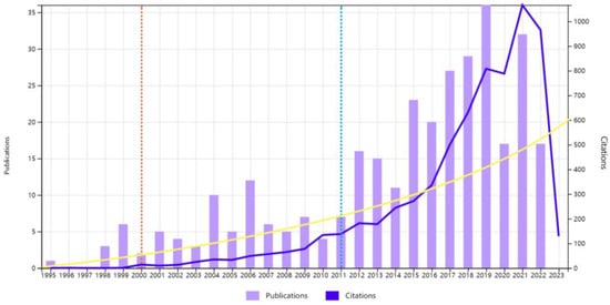 To conduct the quantitative analysis, the “Bibliometrix” R package and “CiteSpace” were employed. The bibliometric tool “Bibliometrix” is an open-source tool for scientometrics, which is powerful and suitable for use with other analytic techniques. This software program established data matrices for co-citation, coupling, collaborative analysis, and co-word analysis and had a quick analysis speed [37]. “CiteSpace”, another bibliometric tool used in this study, is based on the idea of “co-occurrence clustering” for the visualization and scientific analysis of literature. It extracts keywords, subject terms, disciplines, domain categories, etc., at a thematic level, then reconstructs them according to the type and strength of the links between information units, forming networks of different meanings, and then discovers the implicit patterns and laws of knowledge structures in specific disciplines and domains. Another important factor in choosing “CiteSpace” was the ability to output a more aesthetically pleasing and clean image [38,39]. Therefore, “Bibliometrix” was used to extract data at the macro level of the literature, such as annual publication rates, country of authorship, most cited authors, and cited literature, etc., while “CiteSpace” was used to identify key points of development in a field.