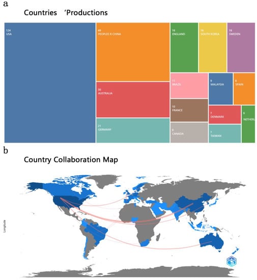 After a rigorous screening process, 135 hydrological research papers were identified. The majority of authors hailed from the United States (142), followed by China (33), Australia (23), Brazil (20), Germany (16), Sweden (13), and the UK (13), accounting for 44, 10, 7, 6, 5, 4, and 4% of the total literature across all countries, respectively. Most countries began focusing on hydrological research after 2000. The co-occurrence analysis provided a comprehensive understanding of the field’s development trends by identifying emerging research hotspots and analyzing ongoing studies [45].