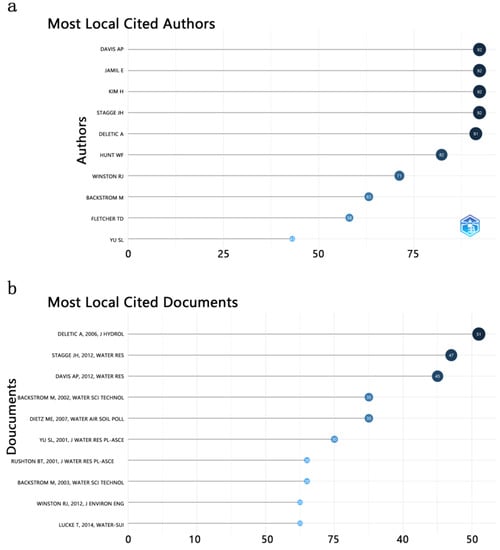Based on the data presented in Figure 4, six of the most productive authors in the field of bio-swale research were identified. These authors, including Davis AP, Jamil E., Kim H., Stagge JH., Deletic A., and Hunt WF, were found to have made significant contributions to the development of the field. In addition, a number of other scholars in the domain were also noted to have played a critical role in advancing bio-swale research. In Figure 4, the most cited documents were listed based on the number of citations. Of these sources, Deletic A’s literature was the most co-cited, with a total of 51 citations. Notably, Deletic A’s work, published in 2006, was found to be particularly influential in shaping the discourse surrounding bio-swale research. The median citation count stands at 32.5, markedly lower than the citation numbers for the three most cited articles. This conspicuous discrepancy underscores the academic community’s acknowledgment of the seminal contributions by Delete A., Stagge JH., and Davis AP (Figure 4). Their work has evidently resonated profoundly within the scholarly milieu, engendering significant academic discourse and thereby accruing a high volume of citations.
