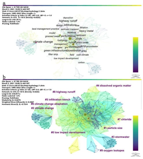 (a) Keywords regarding bio-swales associated with hydrology and a (b) literature co-occurrence network of bio-swale research on hydrology hotspots between 1995 and 2022.