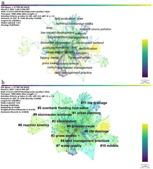 (a) Keywords in bio-swales associated with water quality and (b) a literature co-occurrence network of BS research on water quality hotspots between 1995 and 2022.