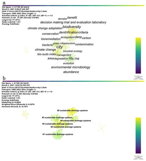 (a) Keywords regarding bio-swales associated with biodiversity and (b) a literature co-occurrence network of BS research on biodiversity hotspots between 1995 and 2022.