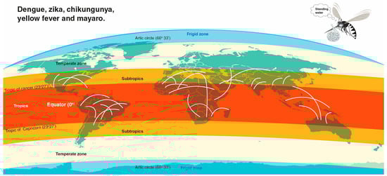 However, the expansion of the Aedes has surpassed geographical barriers, reaching several regions of the globe (Figure 1), with an estimate of it being endemic in over 128 countries [11] as well as being present in other countries. As a consequence, people are infected by different types of arbovirus, increasing the arbovirus diseases prevalence in the world [12].