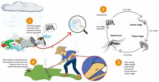 Therefore, the Aedes aegypti female (Diptera: Culicidae), after biting a person infected with one of the disease’s serotypes, becomes a carrier that is able to transmit the virus to other people. It is a diurnal mosquito specimen, black-colored, with white stripes and spots. Its life cycle (Figure 2) comprehends four stages (egg, larva, pupa and adult form), which vary according to the number of existing larvae in the same breeding spot, the temperature and food availability [13]. Therefore, in order to reduce the vector’s proliferation, the interruption of its life cycle via the elimination of breeding spots is necessary, and the aforementioned breeding spots [10,14,15] can be seen in places inhabited by humans [16,17].
