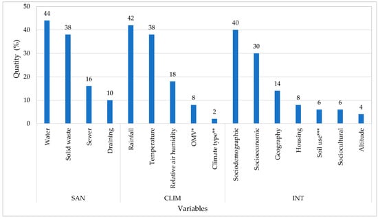 In the process of identifying the variables, it has been observed that in 1995, the productions began associating environmental factors with Aedes aegypti breeding spots and the occurrence of arbovirus diseases. Among the three diseases researched, the most cited one was dengue (and/or hemorrhagic dengue fever), which was present in 92.0% of the publications, while Zika and chikungunya were present in 20.0% and 22.0% of these, respectively. The Aedes aegypti is the most associated vector, as it was mentioned in 52.0% of the articles and cited along with Aedes albopictus in 26.0% of these. The remaining articles (22%) were not associated with a specific type of Aedes. Therefore, among the 50 analyzed articles, because of the specificities of each, 16 distinct variables were identified, which permitted their grouping into three categories as follows: sanitation (SAN), climatologic (CLIM) and integrative (INT) (Figure 4). The data collected can be found in Supplementary Materials Table S1.