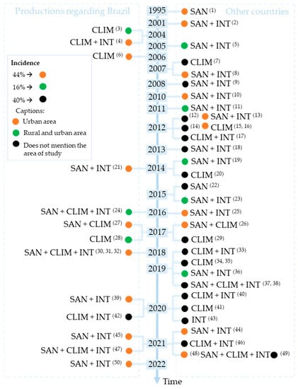 In Figure 5, it is possible to see the number of surveys that were carried out in each country where the relationship with environmental variables was observed. In Figure 6, highlighting Brazil at the left side (the country with the most amount of work produced in this scope), the publications are presented in a timeline along with the distribution per the categories. It was also possible to observe the productions that have focused concomitantly on rural and urban areas 16% (8/50), exclusively urban areas 44% (22/50), involving peripheral areas, and the ones that did not mention the local of the study 40% (20/50).