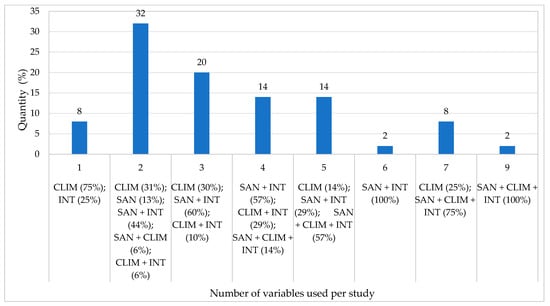 The use of more than one variable in the same study is incipient since 32% of the studies have used two variables, where 31% of these referred to CLIM and 13% to SAN, while the remaining (56%) used a variable of each category in three combinations, where SAN+INT (44%) was the most expressively used.
