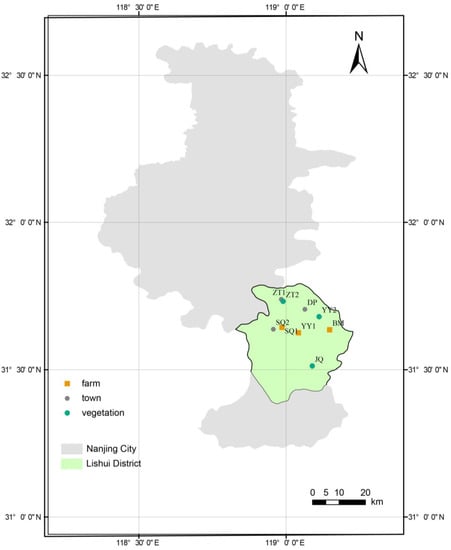 To study the biodiversity and functional differences of small water bodies under different urbanization levels and human activities, a total of 9 small urban artificial lakes or wetland water bodies around cities were selected for a comparative study in Lishui District, Nanjing City, China (Table 1, Figure 1). The common features of these water bodies include the following: (1) the water area is 0.2–0.3 km2, with an average depth of 1–2 m; (2) the shores of the water bodies are not hardened; (3) there is no paved road for motor vehicles within 200 m of the shoreline. According to the different surrounding habitats and land use types, the types of wetlands were further divided into vegetation regions, agricultural regions, and artificial lakes downtown.