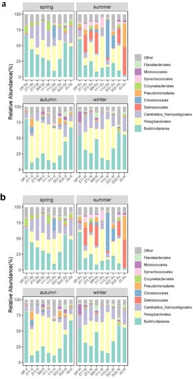 At the phylum level, Proteobacteria predominated in the vast majority of samples, with relative abundances exceeding 50%, except for YY2 summer samples with a higher proportion of cyanobacteria (Figure 2a). At the order level, Burkholderiales had the highest relative abundance (Figure 2b), which has been identified as a keystone species in several different studied ecosystems, mainly including pathogenic bacteria (e.g., Bordetella, Ralstonia, Oxalobacter) and Burkholderia, which are common in terrestrial ecosystems.