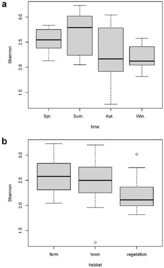 The Shannon diversity for the different seasons was highest in summer, followed by spring, autumn, and winter, but the differences in diversity levels between them were not significant (Figure 3a). Compared with the seasonal trend of the community structure, summer and spring were closer to spring and more obvious in autumn at the level of diversity, indicating that there was a certain continuity in the succession from summer to autumn in the species composition. The level of microbial diversity was highest in agricultural land areas, followed by towns and vegetation areas (Figure 3b).