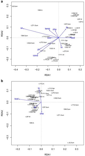 The RDA analysis of the impact of water quality on microbial communities, (a) full model, (b) factors selected using Akaike’s information criterion as the selection criterion.
