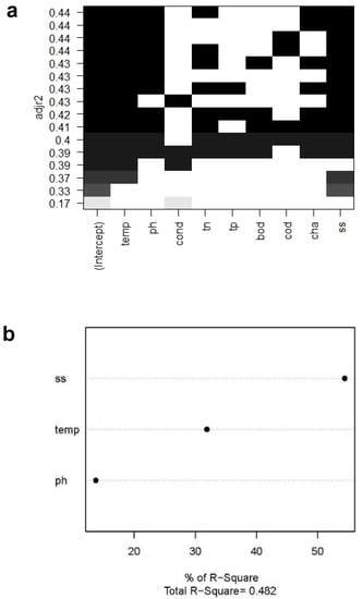 The regression analysis of microbial diversity using water quality indicators showed that the temperature, conductivity, chlorophyll content, and particulate matter concentration significantly affected the level of microbial α diversity (Figure S9). The full subset regression analysis showed that the temperature, pH, and particulate matter content contributed the most directly to diversity levels (Figure 5a), and the general linear models constructed by the three variables reached an R2 of 0.482 for the diversity levels (Figure 5b).