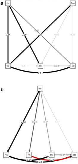 A structural equation model analysis of the effects of biotic and abiotic factors on microbial community (a) and microbial diversity (b). Red arrow indicates negative effect. (Hbt: habitat type; Tmp: temperature; WQ: water quality; FC: fish community; PC: wetland plant community; PA: alien wetland plant abundance; MC: microbial community; MD, microbial alpha diversity).