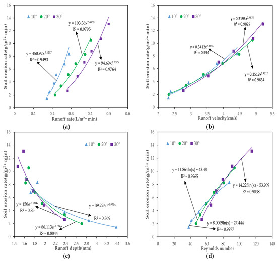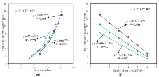 - The relationship between soil erosion rate and flow velocity, Reynolds number, Froude number, and runoff shear stress can be described by power, logarithmic, exponential and linear functions, respectively (p < 0.01). Based on the Pearson correlation and grey correlation analysis results, we tentatively determined that the Reynolds number is the most suitable hydrodynamic parameter to describe the soil erosion process.