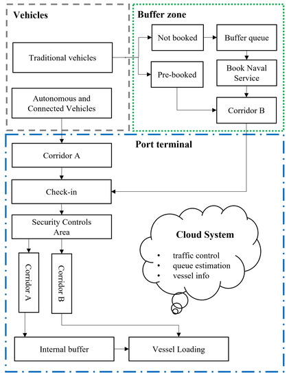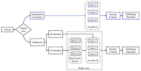 A generic vehicle approaching the port passes through an approach corridor equipped with automatic number plate recognition (ANPR) sensors. Therefore, the system matches in the archive if the incoming vehicle has already confirmed its presence and, in the affirmative case, classifies it as autonomous/connected; otherwise, it is identified as a traditional vehicle. The former proceeds to the inner area of the terminal (in an established lane of the corridor A following variable message) and, according to security controls, it continues up to the internal buffer area ready for the embarking operation. Inside the buffer zone, traditional vehicles were further differentiated in pre-booked and not booked. The first subgroup directly reaches the first available slot in the queuing lanes in the corridor B. Non-booked vehicles have to choose (according to FIFO regulation) a server for ticket operation, reserving their slot in the first available vessel. Once the ticket operation is completed, they reach the proper lane, waiting to be called in the inner area of the terminal for embarking operation (after eventual security controls). Once vehicles are organized in groups, they receive information on the next step and path to the embarking area.