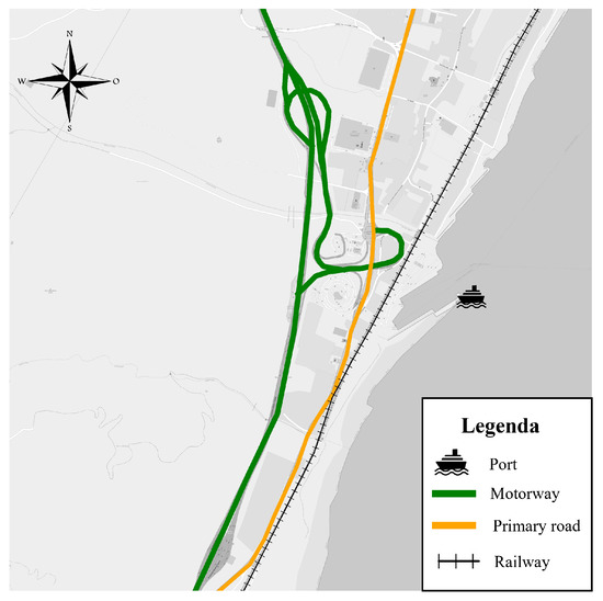 The terminal area considered in this application is the port of Messina-Tremestieri, a port in Sicily Island (Southern Italy) included in the TEN-T comprehensive network. Such a port provides high-frequency services between Sicily and Italy, allowing the continuity of the travel of vehicles (the reader considers that the use of a vessel is the only mode to link the island with the rest of the country). The terminal area is located on the city’s northern border, connected with the motorway and the primary road (Figure 2). It handles trail trucks, heavy freight vehicles and passengers. About 90% of freight arrives and departs from Sicily through its maritime terminals, and the area of Messina-Tremestieri covers a rate equal to 29% [6]. Beyond its logistics relevance in the economy of the areas, the terminal, since 2006, has been permitted to reduce heavy traffic crossing the inner area of Messina.