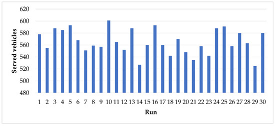 Since the procedure is stochastic, in the same experiment multiple runs were performed to obtain the average performance of the system. In the experiment reported in this section, the system achieved an average served number of 560 vehicles, Figure 4 reports the total amount of vehicles served at each run. The achieved results demonstrate that the number of vehicles that can be served is higher than observed [52]. This shows that, with the proposed procedure, the terminal would be able to handle more arrivals than observed.