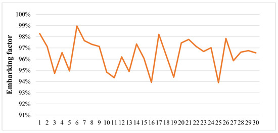 The embarking factor achieved in the simulation assesses how most vehicles can address the objective to be served on board at the first available vessel; rarely, some vehicles belonging to the lower priority class need to wait for the upcoming service. The simulated embarking factor is stable, along with the multiple runs and lower performance capabilities associated with higher traffic volumes exceeding 15–20% the current traffic conditions at the terminal. Generally, the embarking factor never goes below 94%, ensuring that the buffer area and corridors are always considered clear and ready for harboring incoming vehicles.