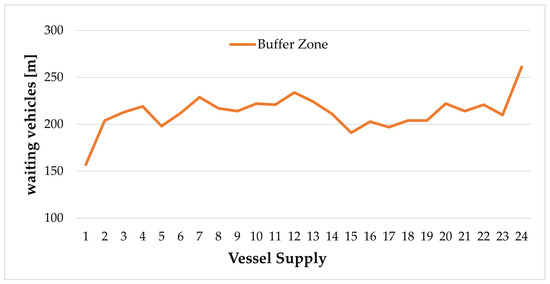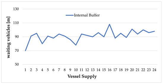 Finally, according to the current vehicle class distribution, it is also possible to foresee the hypothetical system’s evolution by highlighting the average number of vehicles dwelling in the buffer areas for each scheduled vessel departure (a total amount of 25 vessels departures during the eight hours). For the supply, it is assumed that that the loading capacity of a vessel is the number of lane meters of cargo available. Thus, for the demand, the total length of the waiting vehicles has been chosen as a proxy for the number of vehicles. It offers a direct evaluation of the effective length of the queue of vehicles waiting for the embarking operations. Figure 6 reports vehicles’ average occupancy, expressed in metres, waiting in the external buffer zone to be called for the embarking operation.