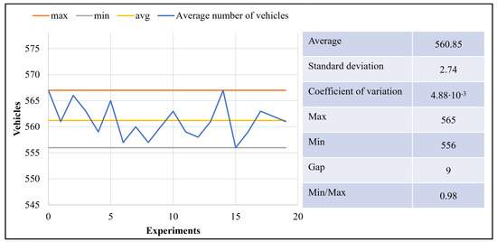 This approach has been designed to be as general as possible, in order to ensure its applicability in different contexts. As the procedure is stochastic, there is no certainty that different experiments will give the same result. However, the results will be very close to each other. Figure 8 shows how different experiments (in this case, 20 different experiments) have given a result, in terms of vehicles served, which oscillates in a range of less than nine vehicles (in a simulation time of 8 hours, thus the variation is slightly higher than a vehicle per hour), with an average value of 560.85 vehicles. Of course, this test can also be performed for the number of waiting vehicles or for the embarking factor.