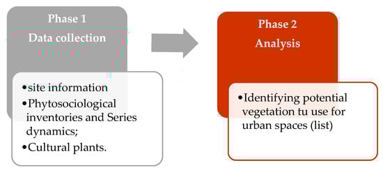 As previously mentioned, this study has to start from a holistic research process. According to the principles of the Portuguese landscape architecture school, the working methodology followed (Figure 3) for the selection of the vegetation system, comes from the use of universal concepts of both landscape architecture and phytosociological science concretely from the Sigmatist School of Zurich-Montpellier proposed by Braun-Blanquet [], Géhu and Rivas-Martínez []—updated by Rivas-Martínez [].