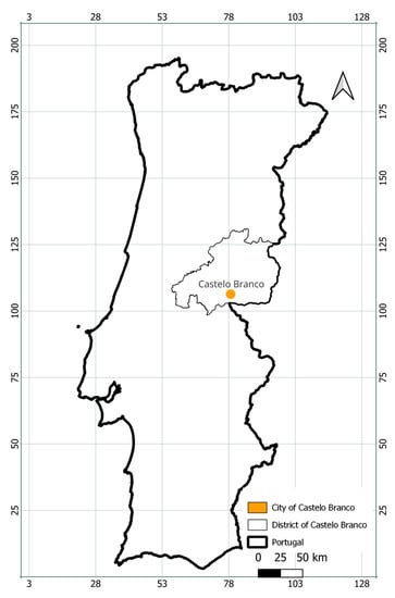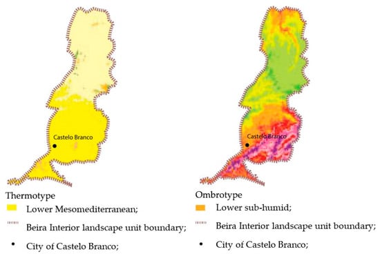 This study started from the city of Castelo Branco (Figure 4), which is inserted in the landscape unit of Beira Interior [], where siliceous soils (schists or grauvaques and quartzites, with predominance of granites) predominate [], with wavy to gentle slopes intercalated with flat areas. According to Capelo et al. [], it is pluviestational-oceanic mesomediterranean lower sub-humid (Figure 5).