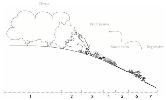 Scheme of a Climatophile Vegetation Series. (1) Woodland; (2) pre-woodland; (3) scrubland; (4) perennial grassland (higher); (5) perennial grassland (low); degraded soils; (6) dwarf-scrub; and (7) annual grasslands.