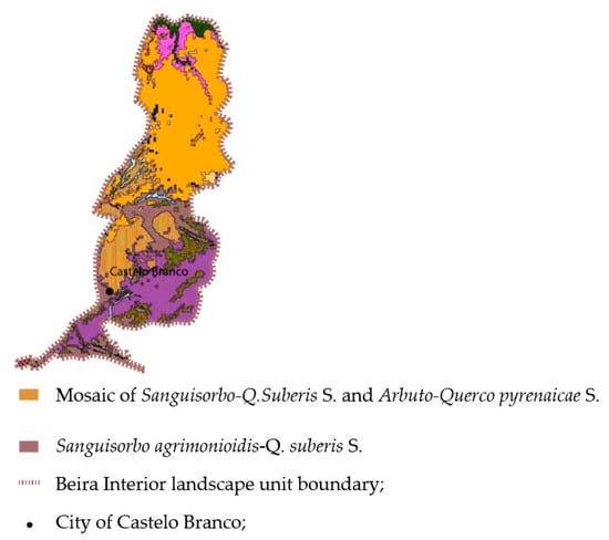 In this sense, for a better selection of the vegetation system the works of Caldeira Cabral and Ribeiro Telles [], Ilídio de Araújo [] and Aurora Carapinha [] should be followed, complemented by works on phytosociological science of Carlos Pinto Gomes [], José Carlos Costa, Carlos Neto, Carlos Aguiar, Jorge Capelo, Maria Dalila Espírito Santo and Mário Lousã [], among others. These works reflect the pioneering spirit of Caldeira Cabral and Ribeiro Telles in deepening the knowledge of the vegetation potentialities in the Portuguese territory. Their proposals present the vegetation system based on the main ecological factors that give the landscape its distinctive units. The data on the vegetation system used in the investigation were obtained through a bibliographic review of updated works on the two areas of knowledge.