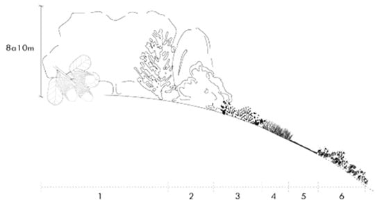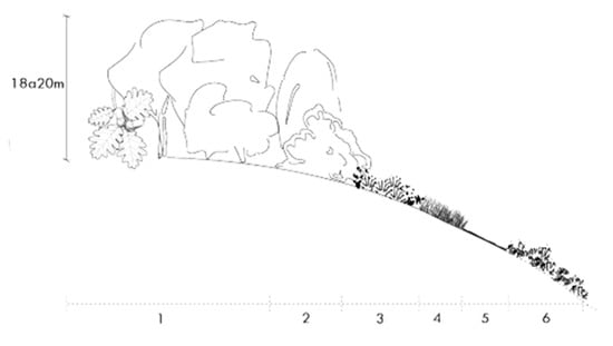 Typical distribution scheme of black oak in Castelo Branco. Subtitle scheme (1) woodland; (2)pre-woodland; (3) scrubland; (4) perennial grassland (higher); (5) perennial grassland (low); degraded soils; and (6) dwarf-scrub.