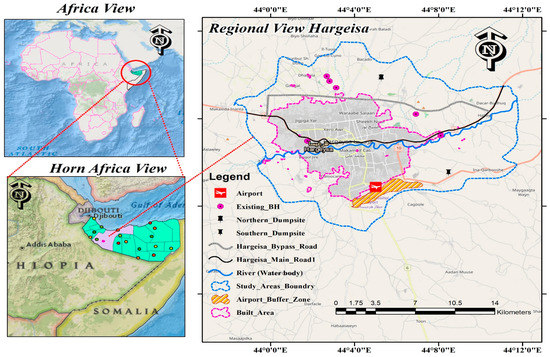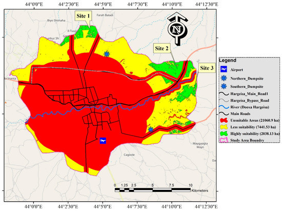 In African countries, roughly 95% of the solid waste produced from different sources is discarded at the peripheries of cities or in open dumpsites [5]. In the context of Hargeisa, the city municipal council (CMC) has not allotted any land for solid waste processing, and, so far, no such facility has been created. Additionally, the city produces more solid waste than its current disposal sites can handle, underscoring the need for a new sanitary landfill system. Moreover, the existing dumpsite (south dumping site—one) is so close to the airport (4.6 km) that it reduces aircraft visibility. Thus, the airport authorities are highly concerned about this threat and have requested that the municipal authority close or shift this site. Therefore, to accommodate the generated solid waste from the municipality, it is crucial to propose a new, reliable solid waste landfill site for the city by considering ecological, environmental, and socio-economic aspects.