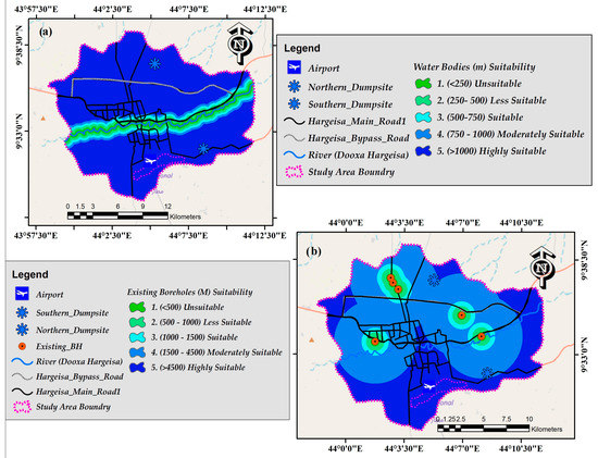 Landfill site suitability criteria for (a) water bodies, (b) distance from boreholes.