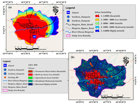 Landfill site suitability criteria for (a) urban areas, (b) LULC.