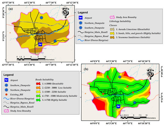 Landfill site suitability criteria for (a) lithology, (b) main roads.