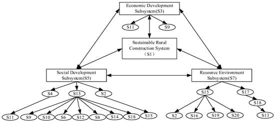 The system of influencing factors for sustainable rural development is a complex system structure. The influencing factors are identified and categorized as the components of the system, where S1 is the target element of the system (Table 1). This establishes the set of elements of the system of influencing factors.