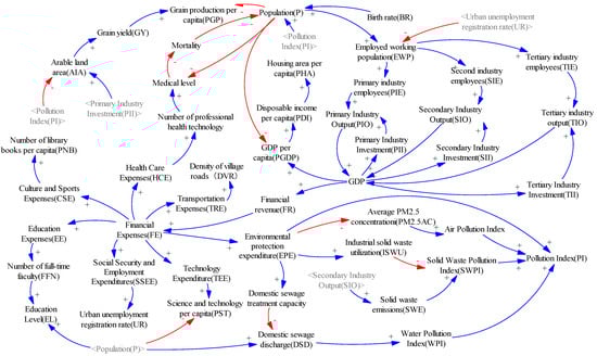 The SD-ISM model focuses on the complex system of sustainable rural development and can better reflect the interaction and feedback mechanisms between elements. The primary purpose of the SD-ISM model is to provide a scientific basis for macroscopic decision making by explaining the internal structure of complex systems, the interactions between structures, and the feedback and control mechanisms between them. The main variables include economic development (GDP), social development (financial expenses, FE), and resource environment (pollution index, PI). This is achieved by building a system simulation model, and the causal loop diagram is illustrated in Figure 2.