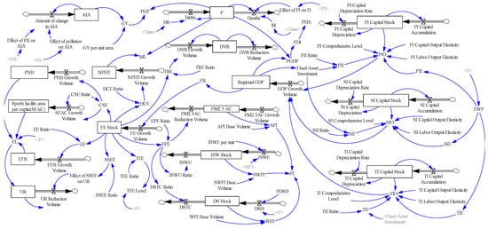 Based on the cause–effect relationship of the sustainable rural development system, VENSIM software was used to map the feedback stock flow (Figure 3). In this section, the mathematical relationships between the main parameters of the factors in the inventory flow diagram are systematically constructed and described. This is used to explore the changes in the factors of the subsystem in sustainable rural development with the behavioral characteristics and trends of the system performance.