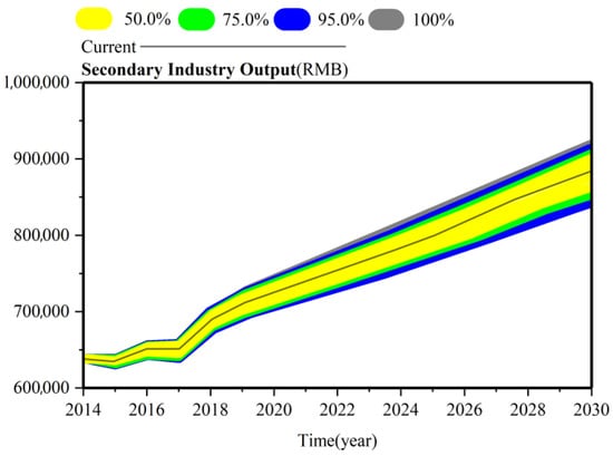 The analyses in Figure 4 and Figure 5 illustrate that changing the rate of investment in secondary production and the proportion of expenditure on environmental protection will have a significant and stable effect on the model. The same method is also followed to test the sensitivity of other parameters, and the test results all pass the sensitivity test. Furthermore, the corresponding policy simulation can be completed by adjusting the parameters of the investment rate of each industry and ratio of various infrastructure and public service expenditures.