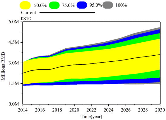 Sensitivity test 2: The model environmental protection expenditure proportion is 0.0362. Using Monte Carlo random uniform distribution with 200 simulations and noise seed 1234, it fluctuates around 100%. The simulation results of the model are illustrated in Figure 5, from which the proportion of expenditure on environmental protection significantly impacts the amount of domestic wastewater treatment. However, its distribution still demonstrates a regular proportional distribution, indicating that the proportion of expenditure on environmental protection has a significant and stable impact on the number of pollutants treated.