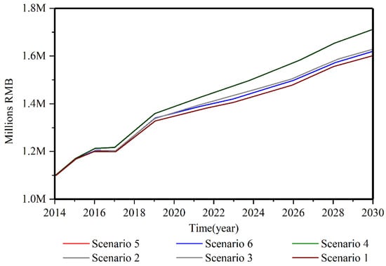The remaining scenario development curves appear to overlap in two ways. Scenario 6 is slightly higher than Scenario 3, Scenario 5 is slightly higher than Scenario 2, and Scenario 4 is slightly higher than Scenario 1, because the current regional GDP of those two scenarios has the same financial input in the gross product. The labor input receives the impact of the population size, while habitat enhancement has less impact on population size growth. Therefore, the regional GDP of Scenarios 1 and 4, Scenarios 2 and 5, and Scenarios 3 and 6 largely overlaps in the graph.