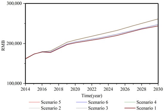As illustrated in Figure 6, the future regional GDP of Zhenze Town increases continuously under all six scenarios. The regional GDP is based on the CD production function in the natural development model. However, the data from 2017 illustrate fluctuations that do not match reality due to the labor input spillover when the production function is regressed. The model demonstrates errors with reality, but the error is around ±5%, indicating that the model has a good simulation effect. Scenario 2 is a policy regulation based on increasing the proportion of investment in the primary and tertiary sectors, with some increase in regional GDP compared to the natural development model. Scenario 2 is designed to strengthen the current dominant industry, the secondary industry. There is also some increase in GDP compared to the natural development model. Scenario 2 is compared with Scenario 3, and the change in GDP growth in Scenario 2 is more significant than the change in growth in Scenario 3. Thus, the industrial optimization model of increasing the ratio of investment in primary and tertiary sectors and increasing the development of the primary sector while driving the tertiary sector is better than the development policy of increasing investment in the secondary sector.