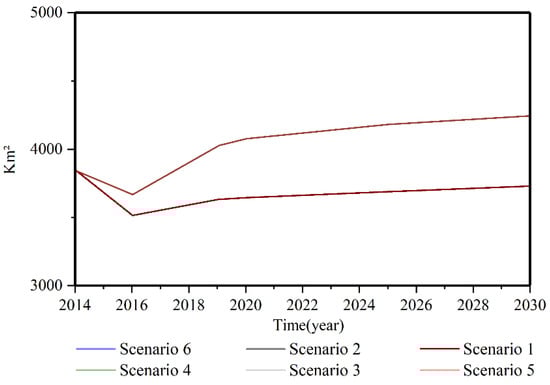 As an essential rural resource, arable land is an important source of national food output and an essential resource for ensuring food availability for the population. As illustrated in Figure 8, the arable land area first decreases and then slowly increases under different scenarios. Under the natural development pattern, that is, the development pattern of Scenario 1, the arable land area declines and then slowly increases, which is more consistent with the historical data. The main reason for this is that the local government attached importance to the status of secondary industries as pillar industries and vigorously developed secondary industries, and arable land resources were destroyed. Subsequently, to maintain the unique rural scenery of Zhenze Town, the local government introduced relevant funding policies. It strongly supported the development of the local plantation industry, resulting in the gradual recovery of arable land. The growth of cultivated land from fast to slow is as follows: Scenario 5, Scenario 2, Scenario 6, Scenario 3, Scenario 4 and Scenario 1. Among them, the growth rate of Scenario 2 and Scenario 5 was much faster than Scenario 1, Scenario 3, Scenario 4 and Scenario 6, which indicates that increasing the proportion of investment in primary industries has a promotion effect on the recovery of cultivated land. For Scenarios 2 and 5 and Scenarios 1, 3, 4 and 6, the curves overlap with very little difference, which indicates that environmental pollution has a negligible impact on the change in the arable land area. However, Scenarios 5, 6 and 4 are all slightly higher than Scenarios 2, 3 and 6, which indicates that environmental pollution has a particular impact on the change in arable land area. However, the magnitude of the impact is smaller.