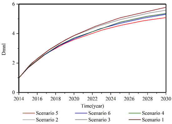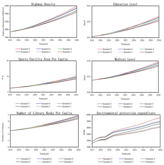 The changes in road density, education level, number of library books per capita, area of sports facilities per capita, health-care level, and expenditure on environmental protection are illustrated in Figure 10. Under all six different development scenarios, a gradual upward trend in the habitat environment is observed. Under the natural development condition, that is, the development pattern of Scenario 1, road density, education level, number of library books per capita, area of sports facilities per capita, medical care level, and expenditure on environmental protection, the results are more in line with the actual changes and have been improved. The growth in road density, education level, number of library books per capita, area of sports facilities per capita, medical care level, and environmental protection expenditures is from fast to slow in the order of Scenario 5, Scenario 6, Scenario 4, Scenario 2, Scenario 3 and Scenario 1. Scenarios 4, 5 and 6 all have higher growth rates than Scenarios 1, 2 and 3, indicating that increased investment in improving the human environment can meet the growing needs. Scenarios 2 and 3 have higher growth rates than Scenario 1, indicating that the level of the local economy has a catalytic effect on improvements in the human environment.